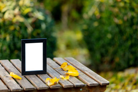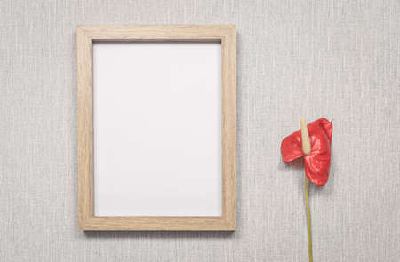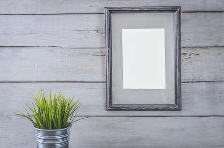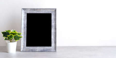 Blank grey vintage wooden frame on table and white wall banckground , banner, with copy space for mock up, template