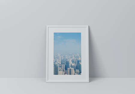 White poster on cabinet floor with blank frame mockup for you design. Layout mockup good use for your design preview. Mockup poster frame in minimalist modern interior background, 3d render