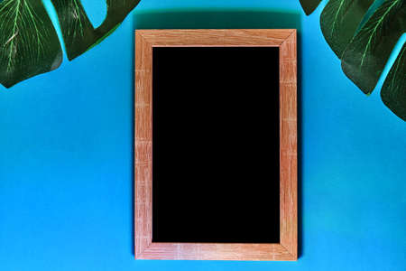 Photo frame and green monstera leaves on blue background with neon lighting. Trendy tropical flat lay concept.
