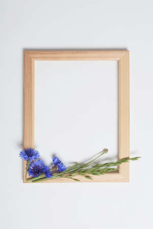 Summer composition with A4 blank silver frame with blank space, summer field plants and shadow overlay.