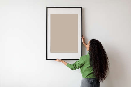 Happy Woman Hanging Empty Poster In Frame On Wall Indoors