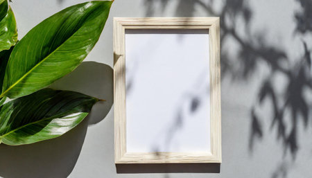 Eco mockup. Empty frame with a blank sheet on a light concrete background and leaves of home plants. copyspace. top view.