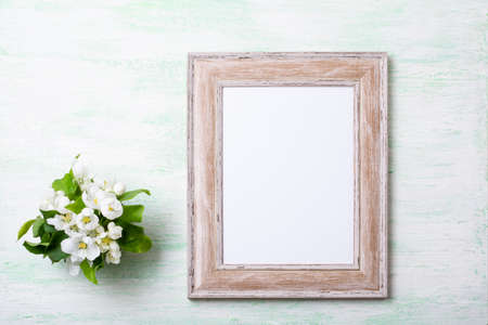Wooden picture frame mockup with apple blossom on the pale green background. Empty frame mock up for presentation design. Template framing for modern art.
