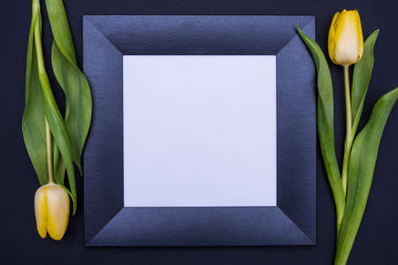 on a black background, there is a black frame with a white background and two yellow tulips on the side, close-up
