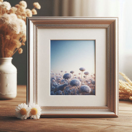 Picture frame with dried flowers on wooden table in room. Mockup for design