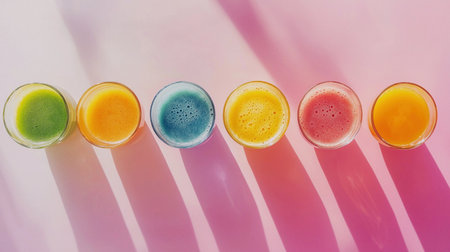 Six smoothie drinks in different colors sit in a row on a soft background. The light creates shadows across the scene.