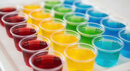 Rows of small clear plastic cups filled with vibrant red, yellow, green, and blue jelly, arranged neatly for a party or celebration.