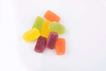 Colorful rainbow jelly on white background, fruit jelly dessert for party. Close up.