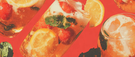 A tall glass filled with ice cubes and colorful fruit slices, creating a refreshing summer beverage