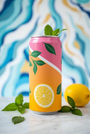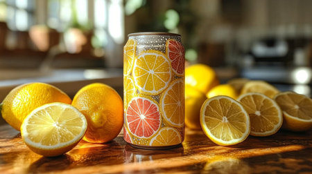 Colorful can surrounded by fresh lemons and lime slices in a bright kitchen setting during daylight hours. Generative AI