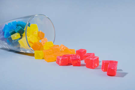 Multicolored jelly candies are sprinkled with sugar on a blaue background.