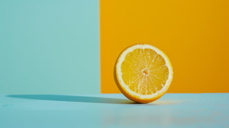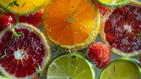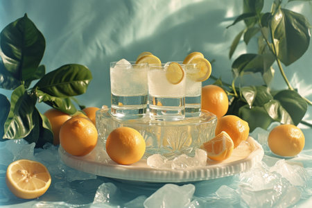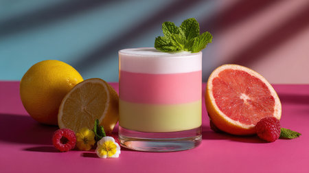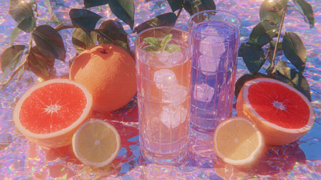 A vibrant composition showcases cut grapefruit and lemon alongside tall glasses holding beverages. The scene features a spectrum of colors, including pink and purple hues, with reflective surfaces adding depth. Ideal for illustrating health, lifestyle, and refreshing concepts, the image is adaptable for various commercial applications.