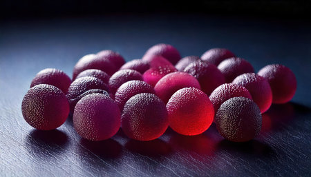 Bright and colorful gummy candies coated with sparkling sugar sit dramatically against a dark background, evoking feelings of joy and indulgence perfect for any celebration.