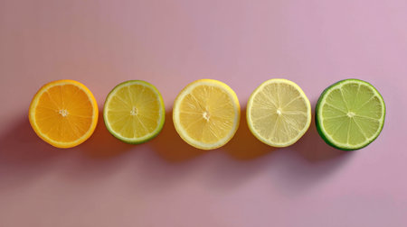 This image features a stunning arrangement of vibrant citrus fruit halves on a soft pink background, perfect for culinary presentations or healthy lifestyle promotions.