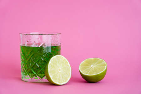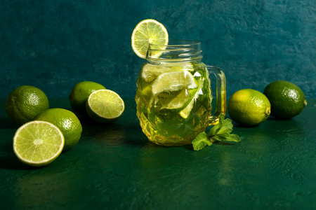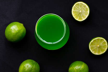 Glass of mojito or natural lemonade with lime slices, on black background.