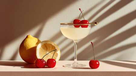 A refreshing cocktail is presented with fresh cherries and lemon, set against a soft, light-toned backdrop. The composition features a clear glass, with a decorative garnish, in a studio-like environment. This image could be suitable for lifestyle, beverage, or food-related commercial applications.