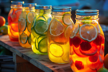 Colorful fruit slices and herbs adorn glasses of sparkling clear water making for a refreshing summer treat