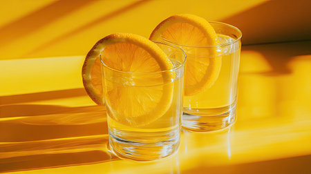 Refreshing homemade beverage with orange slices in clear glasses, creatively displayed on a vibrant yellow surface. Perfect for summer celebrations.