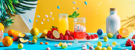 A lively composition of colorful fruit juices, fresh fruits, and vitamin pills, set against a vibrant yellow and blue background, evoking a sense of health and vitality.