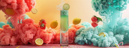A surreal and futuristic scene of a cocktail surrounded by floating fruits and vibrant clouds of color. The imaginative and dynamic composition is ideal for creative beverage advertising, cocktail branding, and surreal food photography.