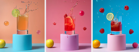 A series of three refreshing fruit drinks in glasses with splashes, set against colorful backgrounds. The dynamic composition, featuring lemons, limes, and raspberries, is perfect for themes related to summer, refreshment, and beverages.