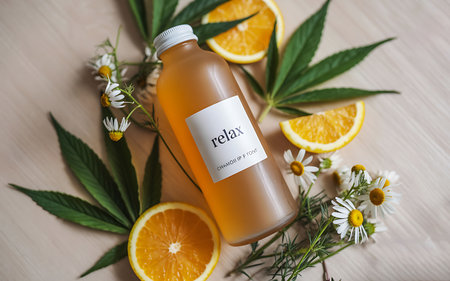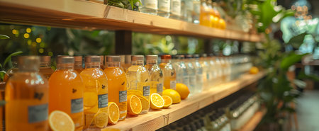 A collection of bottled juices on a wooden shelf, featuring fresh lemons for an inviting look