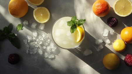 A vibrant citrus drink garnished with mint leaves, surrounded by fresh fruits and ice on a stylish marble surface, perfect for a summery refreshment.