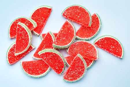 Jelly candies. Top view of jelly candies sprinkled with sugar on a blue background. Watermelon marmalade. Selective soft focus. Organic products.