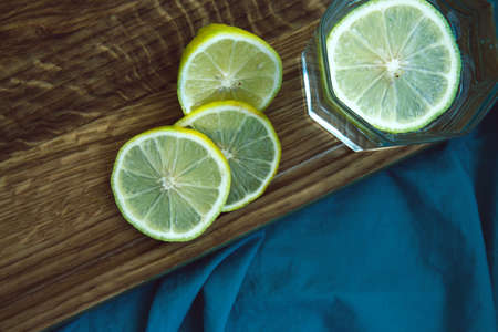 Slices of yellow lemon lie on wooden cutting board. Glass of water with slice of lemon on a background of turquoise fabric. Tropical fruits. Fresh citrus. Top view