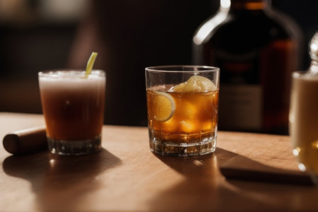 Illustration Glass of alcohol on a wooden table in a bar against a blurred background of people drinking.generative AI