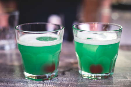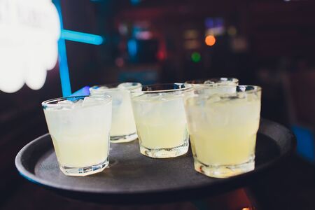 View of different colored alcohol beverage cocktail drinks setting on a bar counter in the night club party, tequila, glasses with martini, vodka, spritz and others on decorated catering banquet table