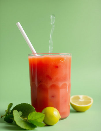 Photograph of a can of soda, surrounded by splashing lemon juice, citrus slices, and berries against a bright pink background, creating a vibrant, energetic, and refreshing visual.