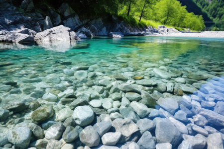 piles of rocks under the crystal clear water of a riverbed, created with generative ai