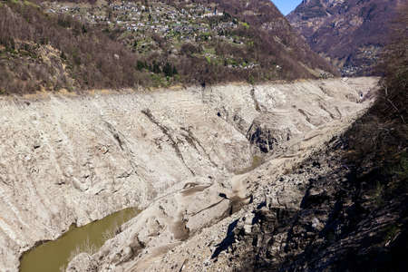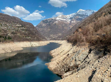 Mountain and lake view from the dam, Valle Verzasca, Switzerland. Sunny spring day