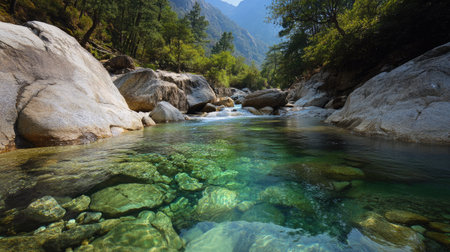 A crystal-clear stream flowing through a rocky valley in the mountains of South Asia, surrounded by dense forest.