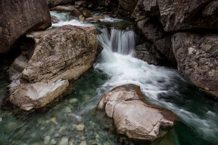 torrent of water falling on the polished rocks of the river bed in a mountain.