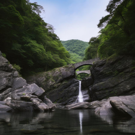 Beautiful mountain landscape with river and bridge in the middle of the forest