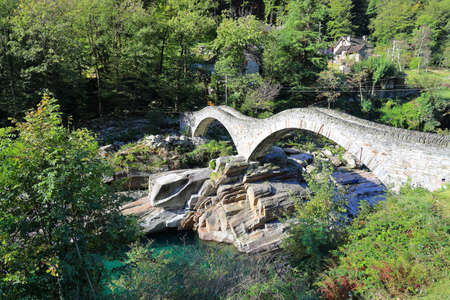 The ancient double arch stone bridge in Lavertezzo. Switzerland, Europe.