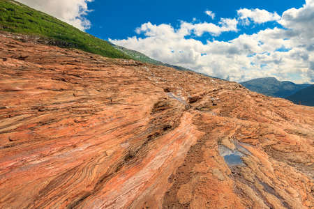 Red sediments and rocks near Svartisvatnet lake and Svartisen glacier in Norway