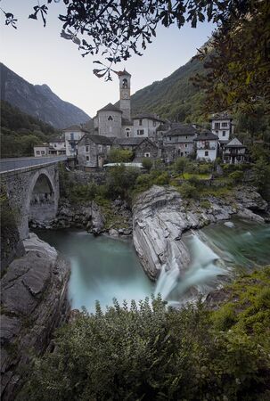 View from the Ponte dei Salti to the beautiful village Lavertezzo with it's famous church in the canton Ticino, Switzerland