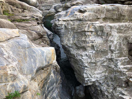 Granite rock formations in the Maggia river in the Maggia Valley or Valle Maggia, Tegna - Canton of Ticino, Switzerland