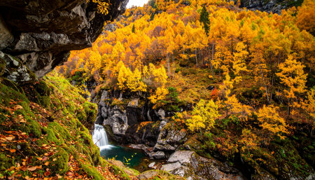 Turquoise water rushes through a rugged rocky gorge in aosta, italy, creating a stunning natural landscape in november's crisp atmosphere pontboset