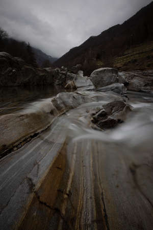 Stone Landscape where the Maggia River flowing through the Maggia Valley in the Ticino in Switzerland