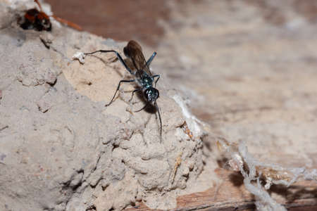 Close up of a Brown legged Black Ichneumon Wasp half body shot crawling down on a dry leaf clear eyes and antennas