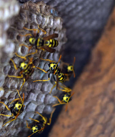 Wasps build a nest. Closeup of a wasp family sitting on a nest. Nature background