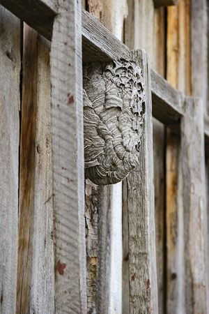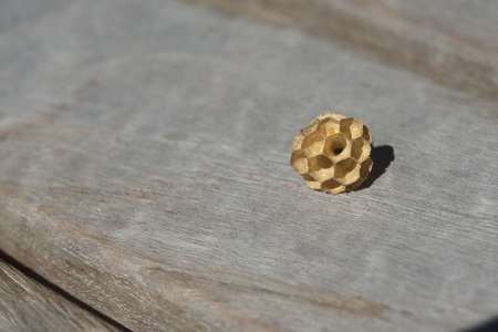 Small wasp nest, made of paper like fiber material, lying on the wooden table that the wasps took the fibers from to build the nest. Much copy space