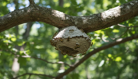 A species of hornet's nest hanging on a tree branch, a paper dwelling, insect pests, stinging painfully, danger in the forest. high quality photo