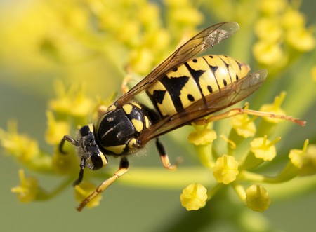 a wasp sits on a yellow flower, macro photography