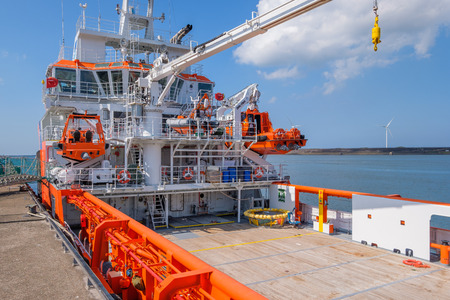 Orange colored EU ship for fishery inspection with an empty deck in the port of IJmuiden, the Netherlands.