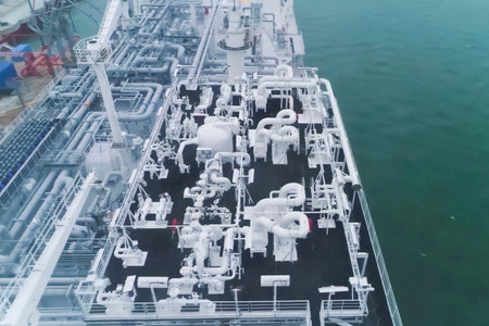 LNG tanker, equipment on the tanker deck. Piping Gate Valves